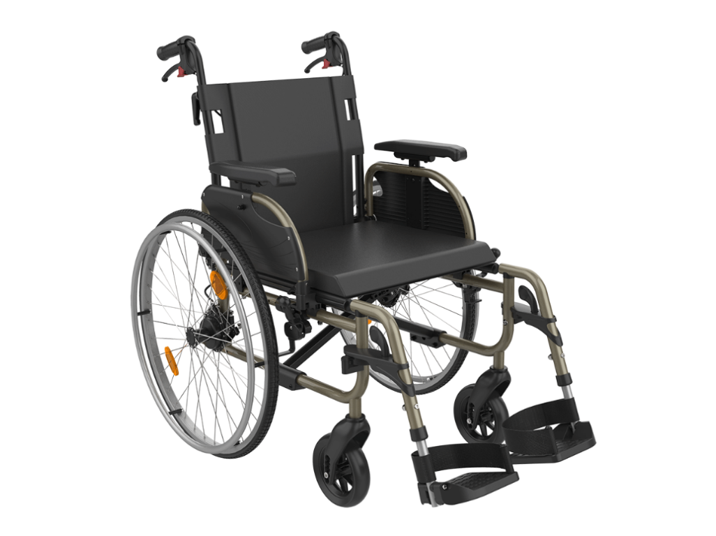 - Zadní kola jsou vybavena pevnými PU pneumatikami odolnými proti propíchnutí, s úchytným kroužkem pro pohon vlastními silami. Zadní kola lze jednoduše z vozíku sundat.